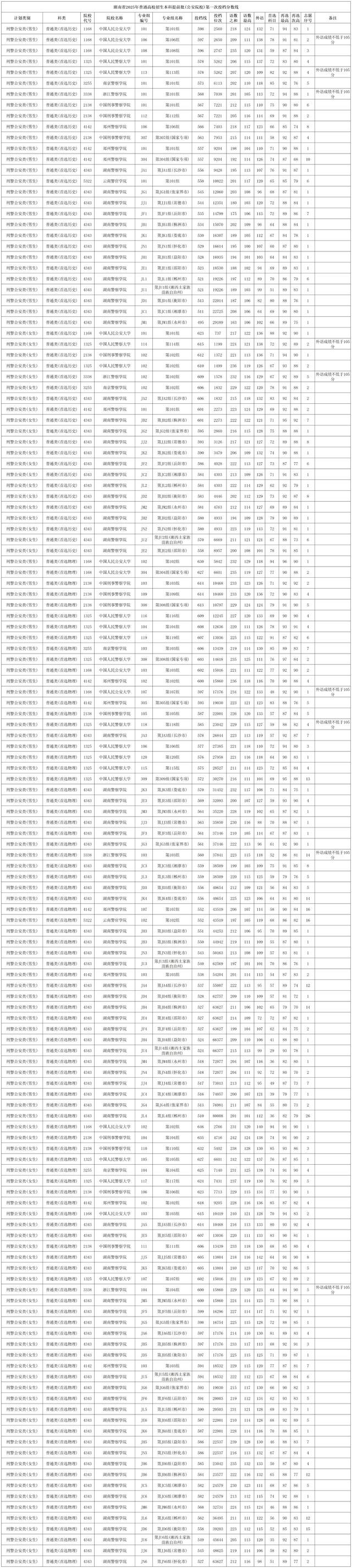 湖南省教育考试院公布了2025年普通高校招生本科提前批(公安院校)第一次投档分数线,男生历史类投档线最高598分,物理类最高630分,女生历史类623分,物理类最高646分。